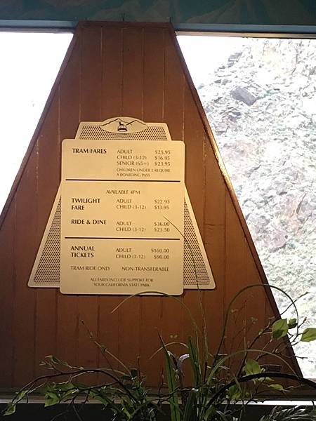 加州棕櫚泉纜車(Palm Springs Aerial Tramway),從1963年開始營業,是目前全世界最大的旋轉纜車,每台纜車可以乘坐80個人。從the Valley Station海拔2643英呎,到the Mountain Station海拔8,516英呎,只需要10分鐘左右的時間。搭上纜車之後,不用擔心自己的位置不好,因為在這十分鐘之內,你一定會慢慢旋轉360度,讓你看盡整個風景,而最好的建議就是把手機開飛航,因為網路也不會通,所以就好好欣賞這美麗的風景,一路上的變化真的會讓你感嘆不已,以前要看到這麼美麗的風景都只有用爬的或開車,現在有纜車真的很適合我這種懶惰的人哈哈。由於我是從洛杉磯出發,大約兩小時的路程,誠心建議各位早點出門,因為到了Palm Springs Tramway,不是你想搭就隨時可以搭的喔,在你排隊買票的時候,他會通知到你可以搭幾點的,等時間到的你才可以過去搭,因為當天睡太晚,大概中午才到達,我們排到的時間是下午2:40(在搭車前十分鐘他會廣播幾點幾分的可以到大廳集合)。